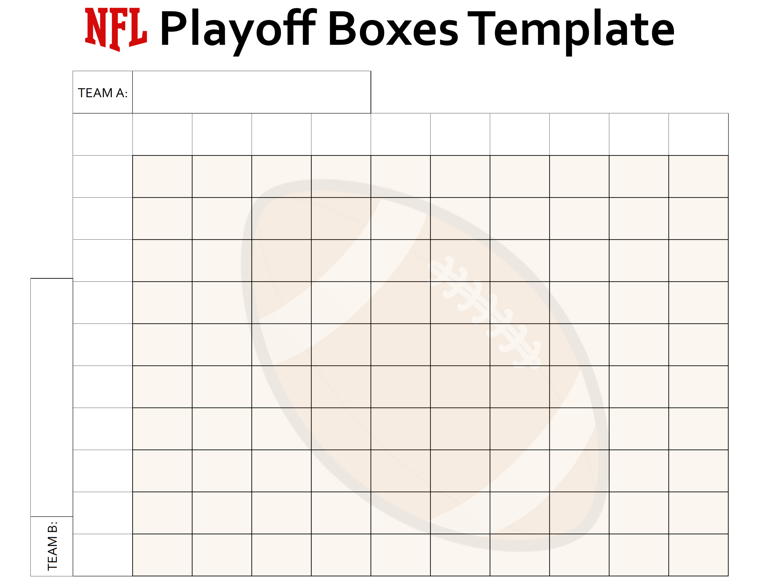 • Clean, printer-friendly NFL Playoff football boxes template with a classic watermark. Ideal for any game from the Wild Card round to the Finals.