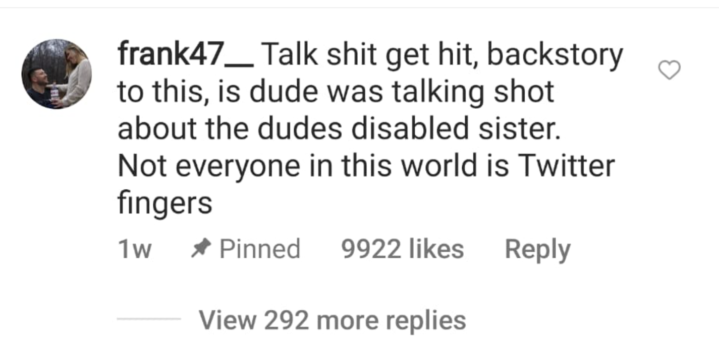 Talk sh*t get hit, backstory to this, is dude was talking shot (sic) about the dudes disabled sister. Not everyone in this world is Twitter fingers