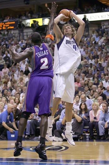 Nowitzki was a great complement to former teammate Steve Nash on the pick and roll. When Nash left for the Phoenix Suns, many felt that both would suffer a drop-off in production, but precisely the opposite has occurred: Nash was named the NBA’s MVP in first year in Phoenix, while in 2004-05 Nowitzki became known as one of the premier scorers in the league. Though Nowitzki now has to create his own offense more without the benefit of Nash’s pinpoint passes, he was able to adjust to the change fairly easily with a combination of driving and stopping in the lane for jump shots.